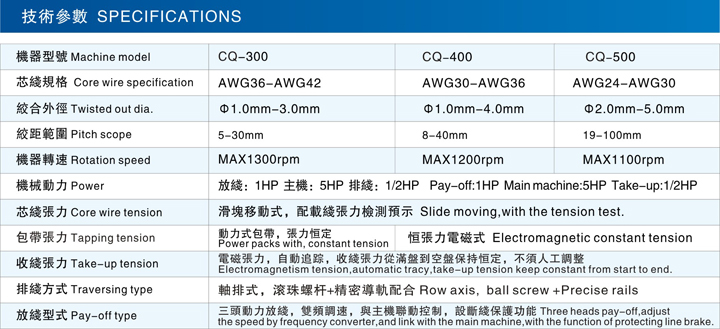 适用于HDMI、DP、USB、CAT-7等高频线、数据线、电子线芯线对绞及多股绞合。